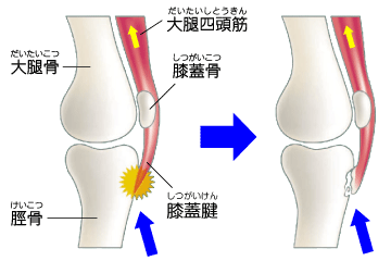 ここは膝蓋靱帯が付着する部位で、大腿四頭筋の強力な牽引力が作用します。