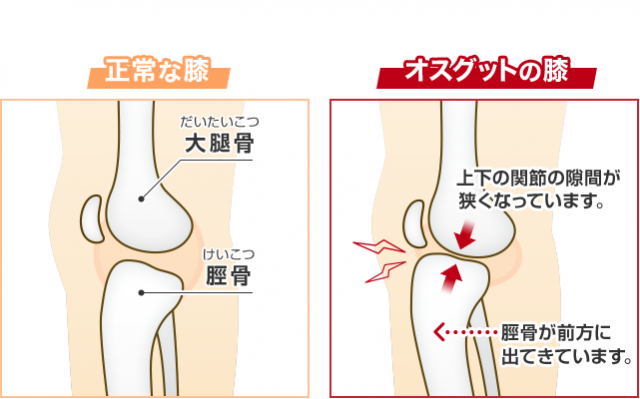スポーツ活動中の12〜13歳の男子に多く、頸骨粗面部の膨隆、圧痛、運動痛などがあります。